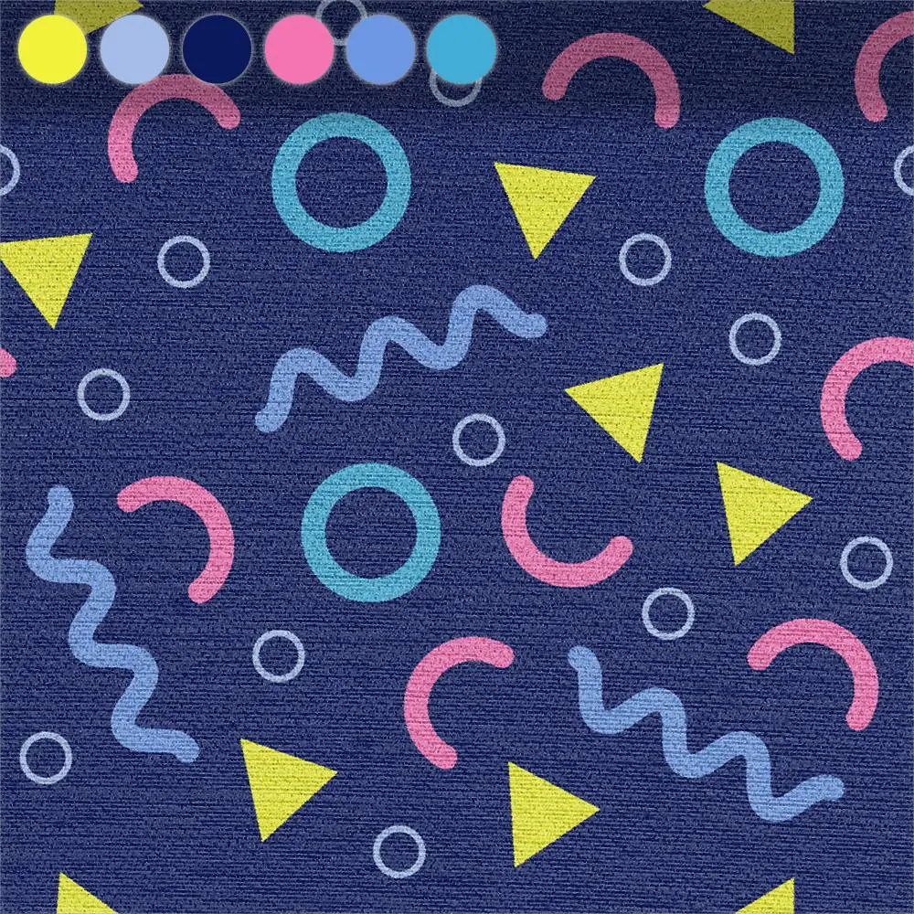 Die farbenfrohen Elemente auf dunkelblauem Hintergrund wirken verspielt und dennoch geordnet. Die Mischung aus Kreisen, Linien und Dreiecken passt wunderbar ins Spielzimmer oder Kinderzimmer, wo lebendige Farben gefragt sind, um den Alltag aufzuhellen.