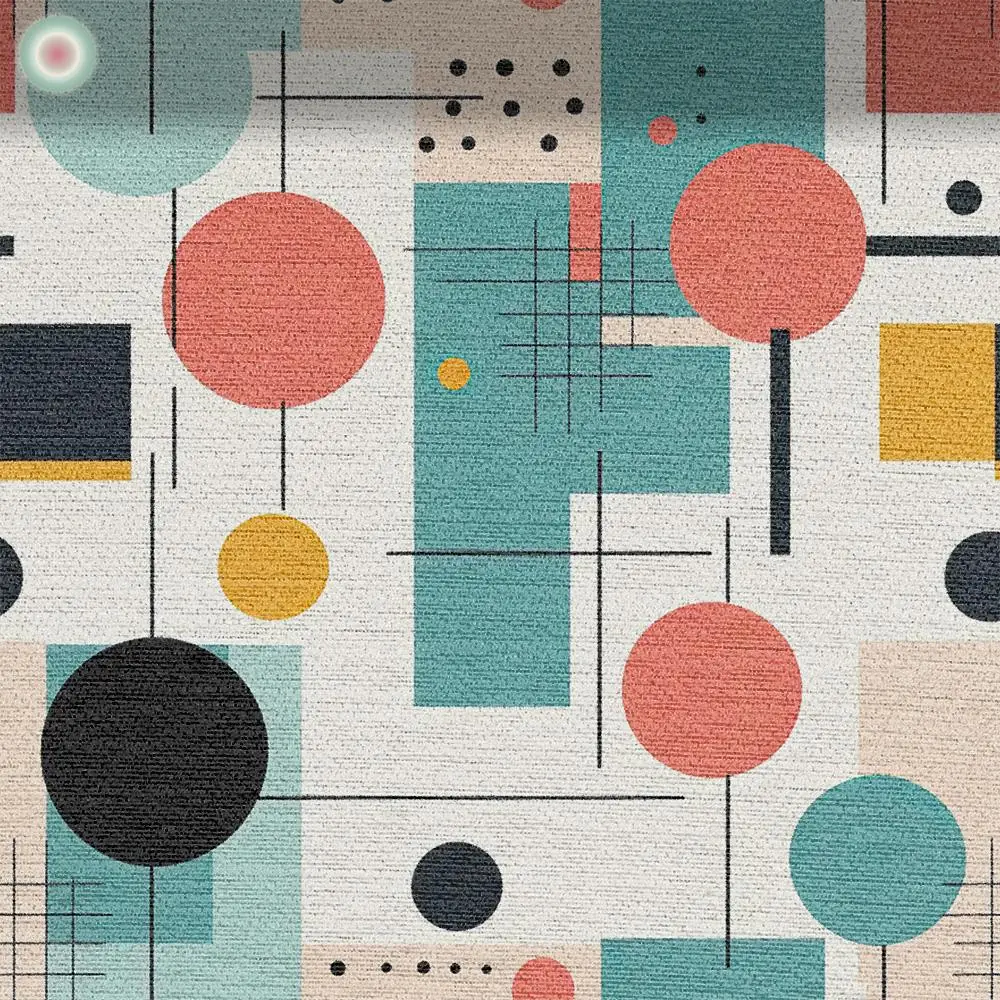 Large circles, clean lines, and soft color tones form a balanced graphic surface. Turquoise, coral, and discreet black set lively accents without disturbing the order of the design.