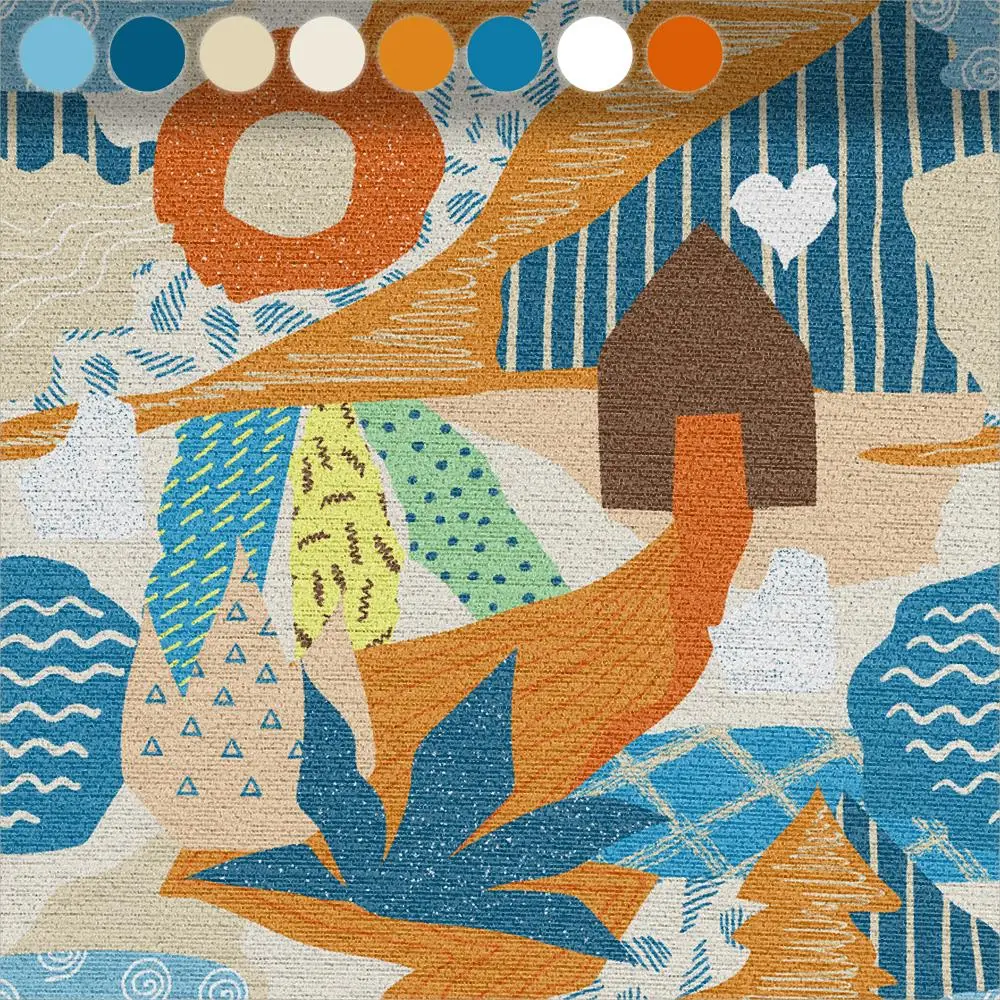This rug resembles a visual adventure in the style of Pop Art. Clear colors, flat drawings, and playful elements in orange, blue, and green form an image full of energy and movement.